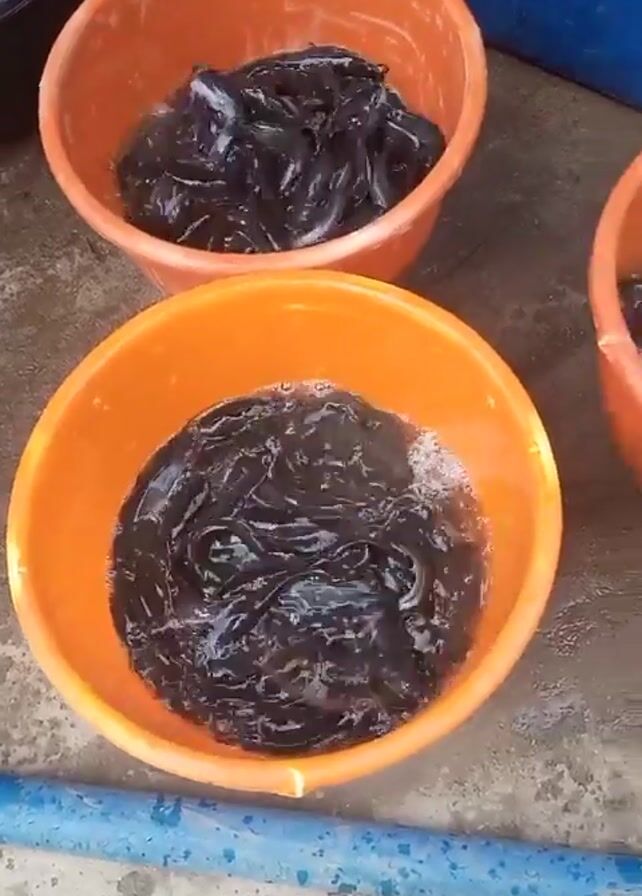 - "three orange buckets filled with small, dark fish in water" by FM-28kcB3, licensed under CC BY 4.0