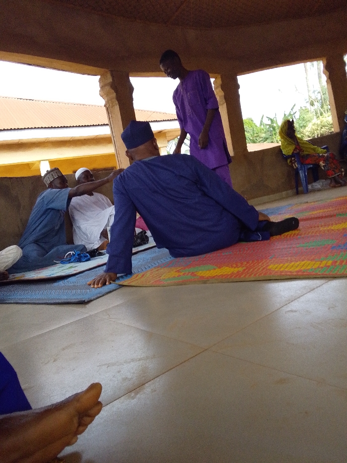 The image depicts an indoor gathering within an open-sided, roofed structure in Emabo, Nigeria. The floor is covered with light-colored tiles, over which woven mats are laid. In the extreme foreground, the bare right foot of an unseen individual is visible on the tiled floor. A male subject is centrally positioned, seen from behind, sitting on a multi-colored woven mat. He wears a dark blue long-sleeved garment and a matching cap, with a black sock on his left foot. He leans back, supporting himself with his right hand on the mat. To the left of the central figure, on a blue woven mat, two male subjects are seated. The closer male wears a light blue long-sleeved garment and a patterned cap, extending his right hand towards the second male. The second male wears a white long-sleeved garment and a white cap. A small, dark object rests between them on the mat. A male subject stands to the right of the central seated figure, wearing a purple long-sleeved garment and matching trousers, facing towards the central figure. In the background, to the far right, a female subject is partially visible, seated on a blue plastic chair. She wears a yellow and green patterned head covering and a patterned dress. The exterior, visible through the structure's open sides, shows a corrugated metal roof and green vegetation under natural daylight.