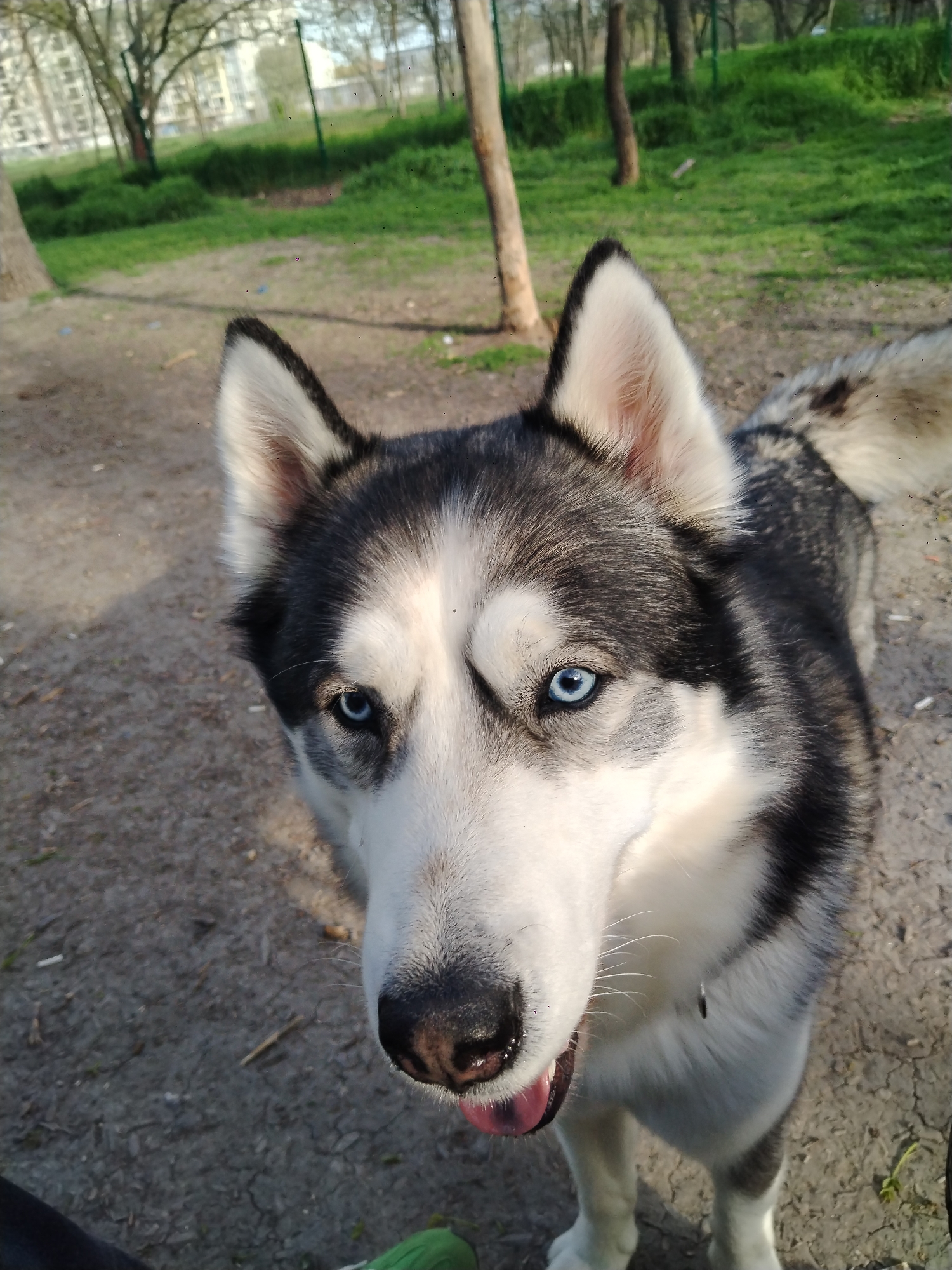 A close-up, slightly low-angle shot shows a Husky dog with striking blue eyes. The dog has a black and white coat and is panting slightly with its tongue visible. The background is a park setting with trees and green foliage. The ground is a mix of dirt and sparse grass. Without further contextual information, determination of the precise location within Plovdiv, Bulgaria is impossible.