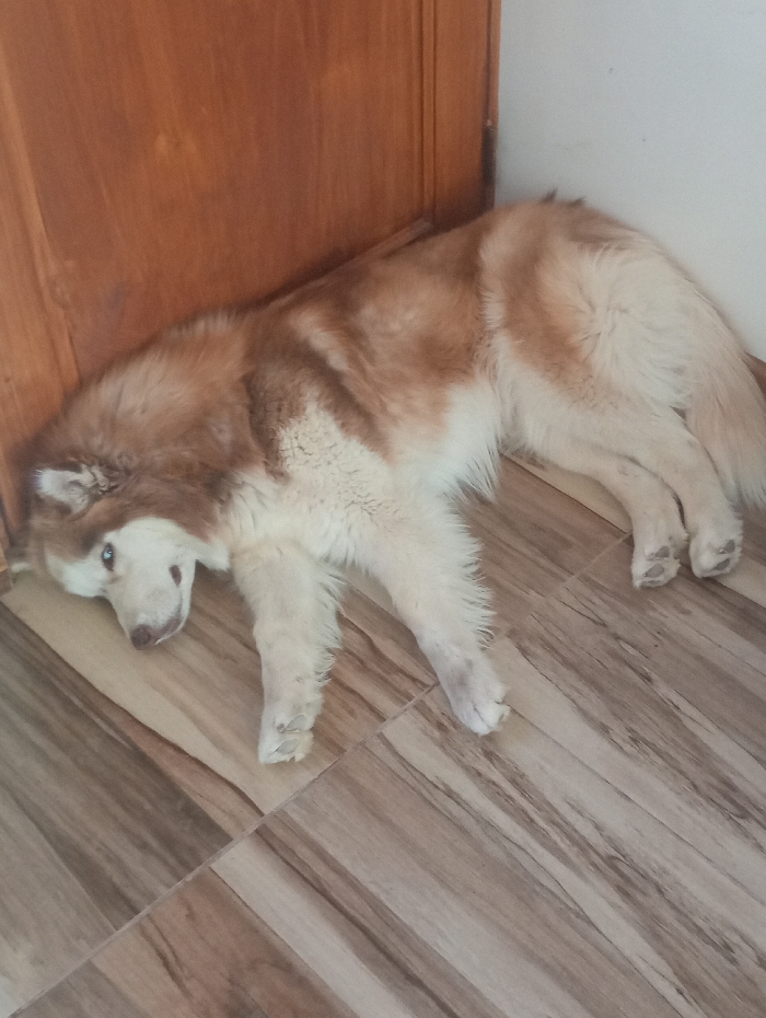 A large dog, identified as a Husky or Malamute type, lies on a tiled floor in an interior location within Pozo Almonte, Chile. The animal's coat is reddish-brown and white. Its head is turned towards the viewer, resting on the floor, with one visible blue eye. All four limbs are extended. The floor consists of rectangular tiles displaying a wood-grain pattern in shades of brown and beige. The background features a corner where a medium-brown wooden structure, possibly a door or frame, meets a light-colored wall.