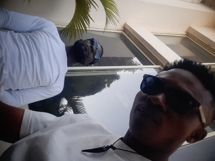 The image displays two adult males positioned outdoors or in a brightly lit indoor space next to a large window. The foreground subject, partially visible from the upper chest, occupies the right side of the frame. This individual is a dark-skinned male wearing dark sunglasses with subtle gold-colored accents on the frame, a plain white short-sleeved shirt, and a dark cord necklace with a black, possibly horn-shaped, pendant. His hair is dark and styled short. His head is tilted downwards and to the left, directing his gaze generally towards the camera. The background subject, positioned to the left and slightly behind the foreground individual, is another dark-skinned male, visible from the mid-torso upwards. He wears dark sunglasses and a long-sleeved white shirt. He has visible facial hair. His head is tilted slightly upwards and to the left. The immediate environment consists of a light-colored building wall with prominent horizontal window frames. The window glass reflects a blue sky, dark green trees, and inverted white text. Visible text fragments reflected in the glass include "SURELY," "DO YOU," and "MIND THE GAP." Green foliage, resembling a palm frond, is present in the lower left corner and also reflected within the window. The scene is illuminated by natural light. The specific location within the city of Jos, Nigeria, cannot be determined from the visual evidence presented in the image.