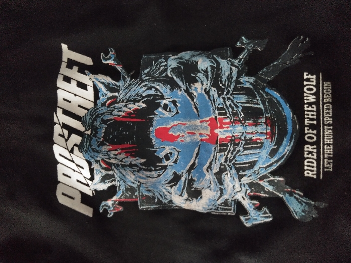 This image is a close-up, high-resolution photograph of a black textile surface, likely clothing, featuring a graphic print. The item is located in Linkebeek, Belgium. The print is centered and prominent, displaying several distinct elements: At the top, the word "PROSTREET" is rendered in stylized, fragmented white capital letters with a distressed appearance. Below this text is a complex graphic dominated by a menacing, stylized wolf-like head or a creature resembling an armored helmet. This central image is depicted primarily in shades of blue, white, and black, with notable red accents. Sharp fangs are visible at the mouth, from which red, blood-like drips extend downwards. Similar red streaks are present across the face and eyes of the creature. The design incorporates mechanical or skeletal elements, suggesting a fusion of organic and inorganic forms. Below the main graphic, two lines of white text are present: The first line reads "RIDER OF THE WOLF" in a bold, sans-serif font. The second line, in a smaller font, reads "LET THE HUNT SPEED BEGIN". The black fabric background shows a subtle woven texture, and the print exhibits slight variations in color saturation and detail consistent with screen printing on textile. No surrounding environment or human presence is visible in the frame.