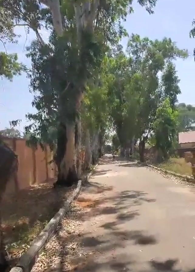 narrow paved road lined with tall trees. The trees have light-colored bark and green leaves, and they cast shadows on the road. A concrete curb runs along the side of the road. There is a brick wall visible on the left side of the road and a building on the right. A person is visible in the distance walking down the road. The sky is blue.