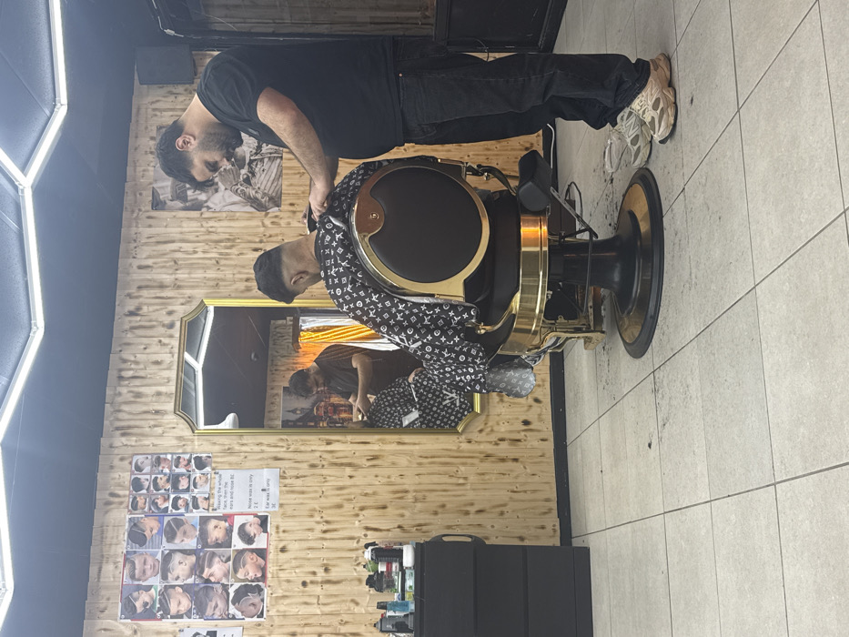 The scene depicts the interior of a barbershop located in Welshpool, United Kingdom. A male barber, dressed in a black t-shirt, dark jeans, and light-colored sneakers, stands on the right, actively trimming the hair on the back of a male client's head using electric clippers. The client is seated in a prominent black and gold hydraulic barber chair, facing away from the camera, and is draped in a black cape adorned with a white monogram pattern. Both individuals, as well as the barber's actions, are reflected in a large, ornate gold-framed mirror mounted centrally on the wall. The walls feature light-colored wooden slat paneling. To the left of the mirror, a poster displays various children's hairstyles along with text detailing services and pricing, including "Shaving the whole face, then the ears and nose 8£", "Nose wax is only 2£", and "Ear wax is only 3£". On the far left, a black multi-drawer cabinet holds various hair care products and tools. The floor is composed of light grey tiles, with visible hair clippings scattered around the base of the barber chair. Overhead, hexagonal LED light fixtures illuminate the area. A black speaker is mounted high on the right wall, near the top right corner of the mirror.