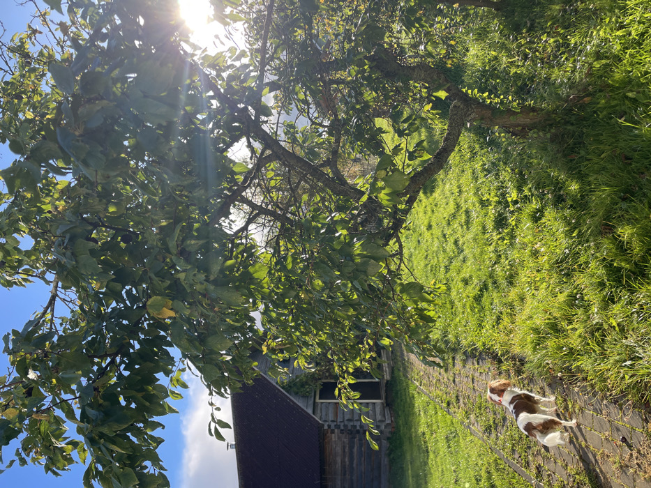 The image displays an outdoor daytime scene in Kozhino, Russia. In the background left, a rustic log-built structure with a dark, pitched roof and a visible chimney stands, featuring an open, dark doorway on its side and some vertical vine growth. A light-colored paved pathway, composed of individual stones, extends from the foreground left towards this building. A medium-sized dog, likely a Cavalier King Charles Spaniel or similar breed, with white and reddish-brown fur, stands on this path in the mid-ground, facing away from the viewer towards the building. Its tail is visible. The foreground and mid-ground are covered in vibrant green grass with some longer blades and dandelions. A prominent deciduous tree with numerous green leaves, some exhibiting early yellowing, occupies the central and right portions of the frame, with its gnarled trunk visible. Bright sunlight emanates from the upper right, creating a distinct lens flare and casting strong illumination across the scene, particularly on the grass and tree leaves. The sky in the upper left shows blue with scattered white clouds. No human subjects or interactions are present.