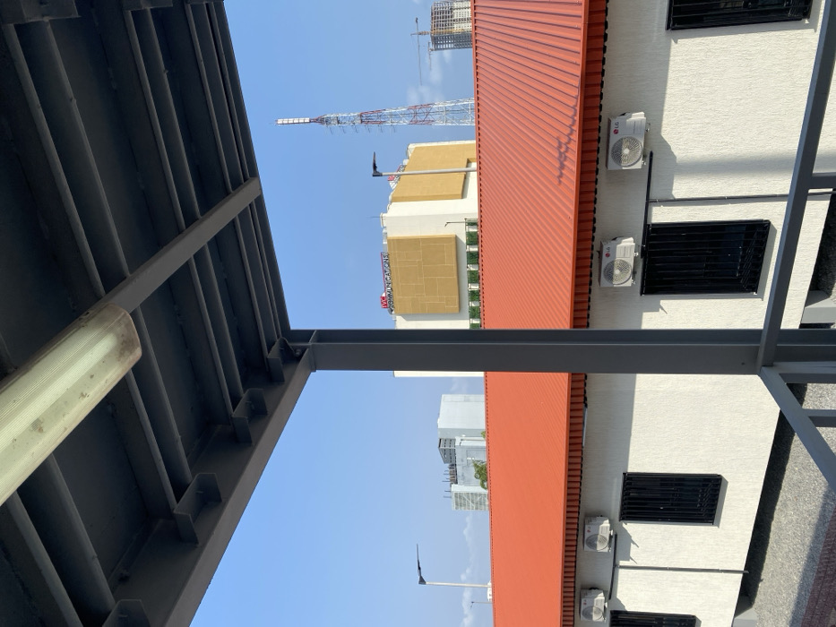 This image captures an urban landscape in Inupa Kekere, Nigeria, viewed from beneath a grey metal structural canopy or walkway. In the immediate foreground, the underside of a dark grey metal structure is visible, featuring a network of beams and supports. A single, horizontally mounted fluorescent light fixture, appearing dusty or aged, is centrally positioned within this overhead structure. Below this, a grey metal handrail forms the bottom edge of the frame. The midground is dominated by a white, single-story building topped with a prominent, corrugated orange roof. The building's exterior wall, textured white, displays four black-barred windows. Above these windows, four outdoor LG brand air conditioning units are mounted, evenly spaced along the wall. Beyond this orange-roofed structure, several taller buildings are visible against a clear blue sky. A prominent white building in the background features the red text "IWC COMMUNICATIONS" on its upper facade, below which is a large rectangular section with a gold or yellow, possibly panelled, exterior. To its right, a tall red and white latticework telecommunications tower stands against the sky. Further in the background, additional modern buildings are visible, with at least one appearing to be under construction, indicated by a visible crane. The overall environment suggests an active urban area under clear weather conditions. No people or overt actions are discernible within the frame.