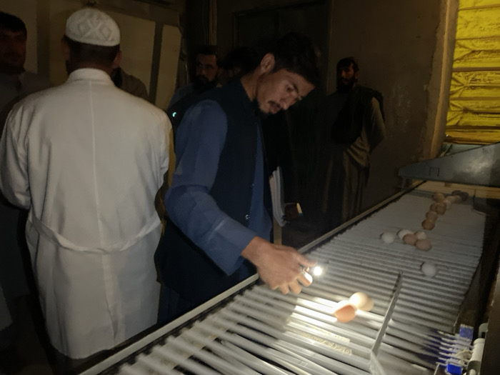 The image depicts an indoor scene at a facility in Shuyene Vosta, Afghanistan, centered around an egg processing operation