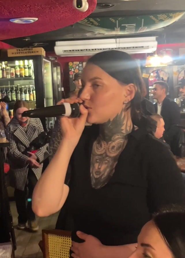 A woman with dark hair pulled back, wearing a black V-neck shirt, is singing into a microphone in what appears to be a crowded bar or pub. She has a prominent tattoo covering her neck and upper chest. Other people are visible in the background, some seated and others standing. There is a woman seated at a table in the foreground to the right of the singer. The bar is visible behind the singer, with shelves of liquor bottles. The ceiling is decorated with various signs and objects. The lighting is a combination of natural and artificial light.