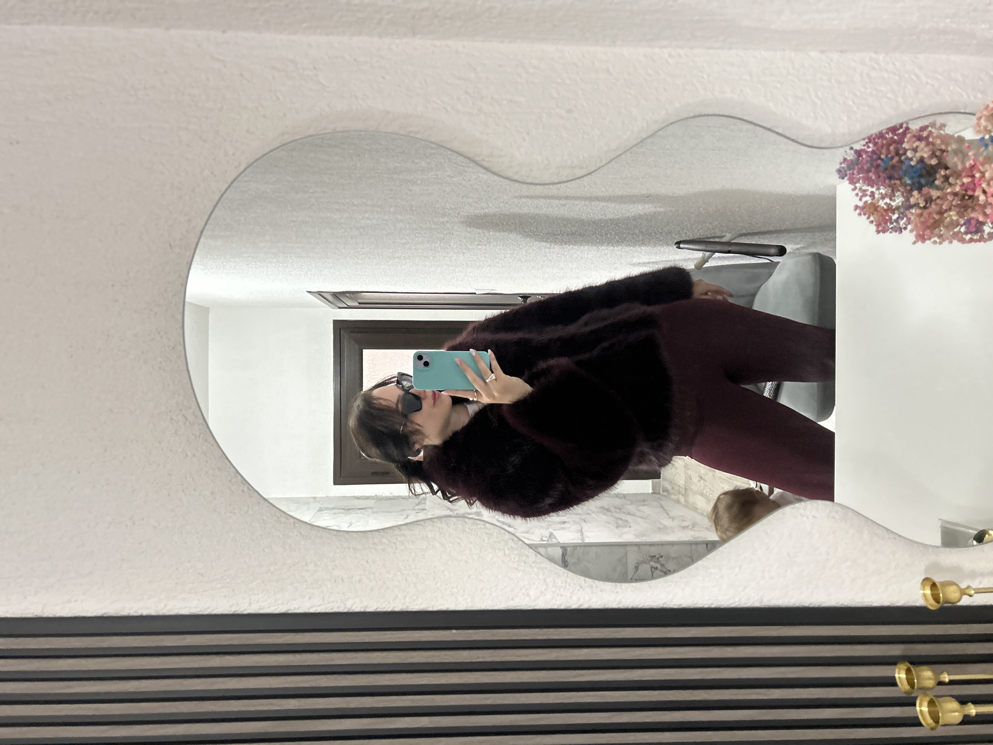 In the city of Zlatograd, Bulgaria, a female subject is depicted in a mirror reflection, positioned centrally within an irregularly shaped, wavy mirror. The woman wears dark sunglasses, a dark burgundy faux fur jacket over a lighter top, and dark burgundy pants. Her dark hair is pulled back, with some strands framing her face. She holds a light blue smartphone with her right hand, which displays rings on its fingers, angled to capture her reflection. The mirror reflects a background of white or light-colored textured walls. A dark-framed doorway is visible behind the woman's left shoulder, leading to another room or hallway. A partial view of a young child with light-colored hair is visible in the lower-left portion of the mirror's reflection, behind the woman. To the right of the woman's reflection, a grey upholstered chair and a dark, slender wall-mounted object are discernible. Outside the mirror, the surrounding wall is textured and light-colored. To the immediate left of the mirror, a section of vertical decorative paneling with alternating dark and light grey strips is present. In the foreground, below the mirror, a white surface holds three golden candlestick holders on the left and a bouquet of dried or artificial flowers in shades of pink, blue, and purple on the right.
