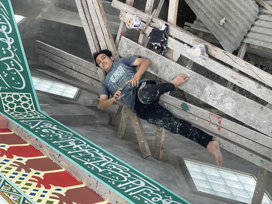 The image depicts a construction or renovation scene in the city of Kumbang, Indonesia, likely within a religious structure given the Arabic calligraphy. A young adult male, barefoot, with short dark hair, is resting or reclining on a makeshift wooden scaffold platform, positioned diagonally across the frame. He wears a dark grey t-shirt and black pants, both heavily splattered with various colors of paint, notably green, red, and white. His left arm is bent with his hand near his chest, while his right arm is bent with his hand near his head. He looks directly at the viewer. To his left, a partially decorated wall features elaborate patterns. The upper section displays a red background with off-white/cream architectural motifs. Below this, a teal-green band contains white Arabic calligraphy. A distinct geometric star pattern is visible within another section of the teal band. The wall further left, not fully in view, also shows more red and cream/off-white patterns. Unfinished grey concrete walls are visible in the background, with two rectangular window openings featuring glass blocks, allowing natural light into the space. On the wooden scaffold near the individual, a small white plastic bucket and a paintbrush are present. A crumpled piece of dark fabric, also paint-splattered, lies nearby. Further down the scaffold, a transparent plastic bag containing a brown object is visible. The wooden planks of the scaffold are stained with numerous paint drips. Below the scaffold, corrugated metal sheets and a dark, uneven ground surface are partially discernible.