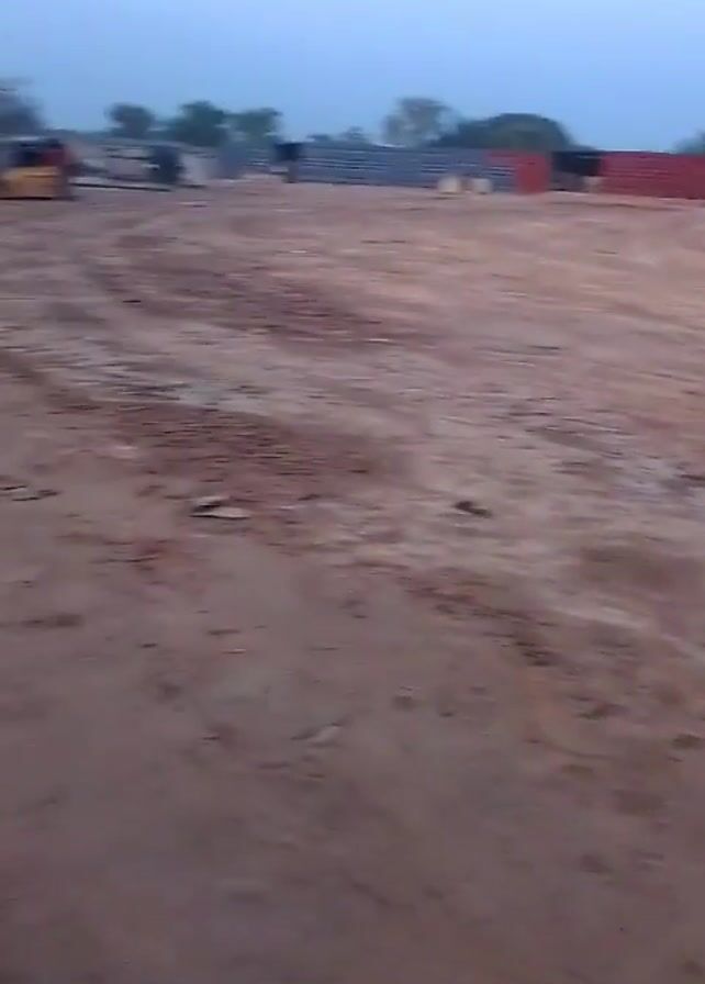 The video begins with a view of a large, dusty, dirt-covered lot with what appears to be red shipping containers in the background