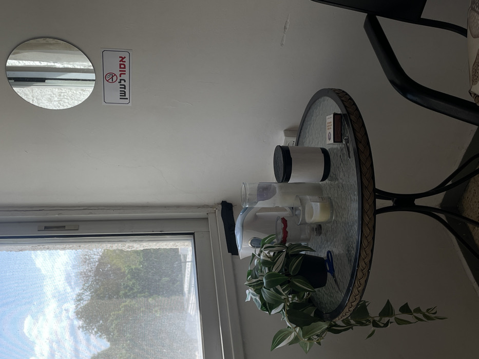 The image depicts an indoor corner space within a building in the Brener Regional Council, Israel. A round, glass-topped table with a woven-textured rim and black metal legs occupies the lower-center and lower-right foreground. On the table, a black potted plant with trailing variegated green and white leaves is positioned on the left. To its right are a white electric kettle, a small red and white container, a tall clear glass cylinder, and a clear glass votive holding a white candle. Further to the right, a black and white cylindrical container with a black lid is present, alongside a small brown matchbox and a metallic object resembling a key. A pair of blue scissors is partially visible beneath the plant pot. The rightmost portion of a black chair with a patterned cushion is visible in the lower right. The wall behind the table is light-colored, showing minor surface imperfections. An electrical outlet is present on the wall, approximately centered above the table. Above the outlet, a white rectangular sign displays a red circle-slash "no smoking" pictogram and the Hebrew text "אסור לעשן" (No Smoking). Above this sign, a circular mirror is mounted, reflecting a window frame. To the left, a large window with a white frame and visible screen pane offers a view of the exterior. Black tape is affixed to the lower section of the window frame near the corner. Beyond the window, a bright blue sky with white clouds is visible above dense green trees and foliage.