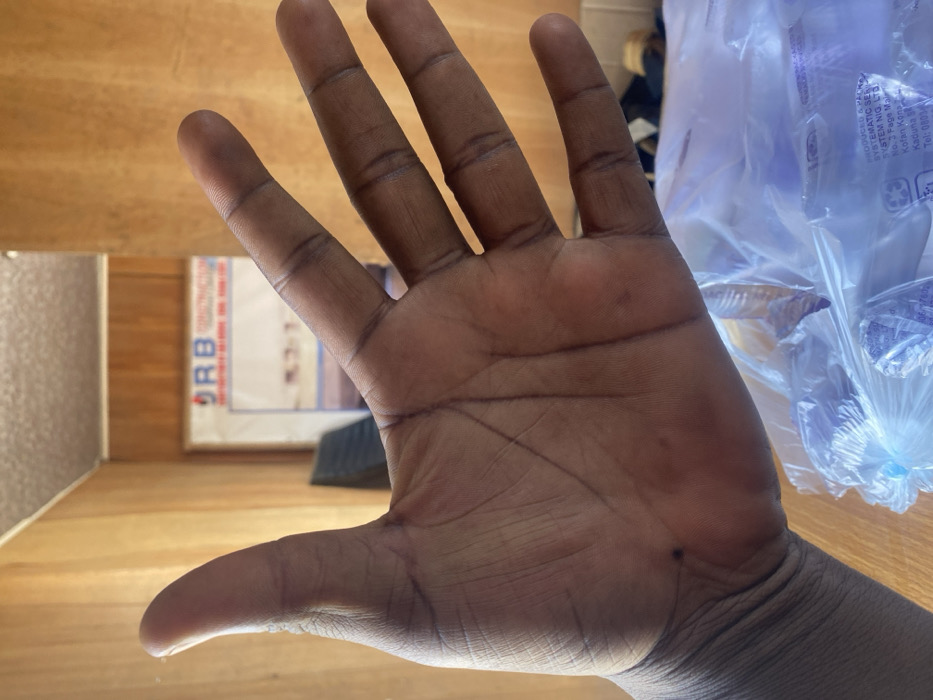 The image displays the open left hand of an individual, palm facing the camera, dominating the foreground
