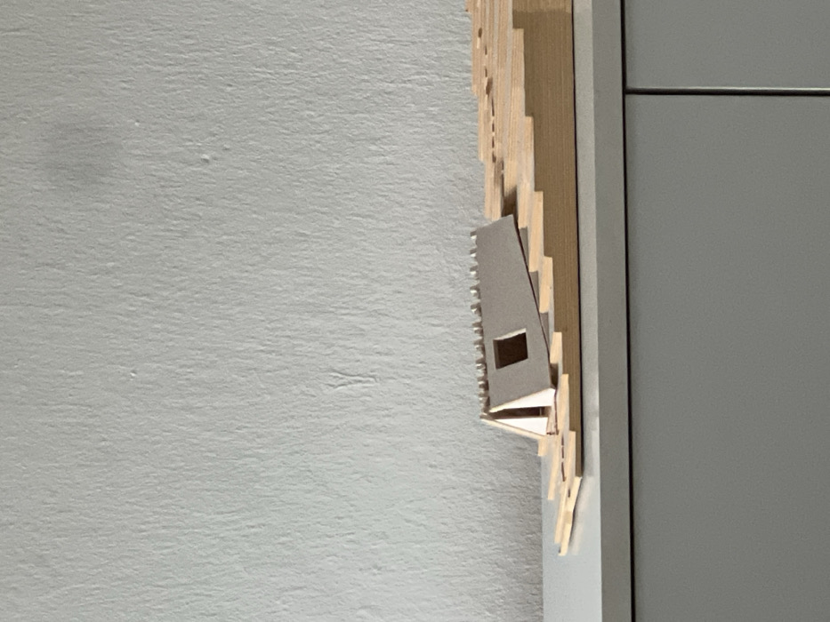 The image displays an architectural model situated on a planar, light grey surface. The background consists of a textured, light grey wall. The model is crafted from light-toned wood or cardboard. It features a series of ascending, stepped horizontal planes forming a terraced landscape. Positioned on a lower section of these steps is a small, off-white structure characterized by an A-frame or pitched-roof design. This structure has a single rectangular opening on its visible side and a serrated edge along its roofline. No individuals are present, and no actions or interactions are depicted within the scene. The specific location within Poznan, Poland, cannot be determined from the visual information provided.