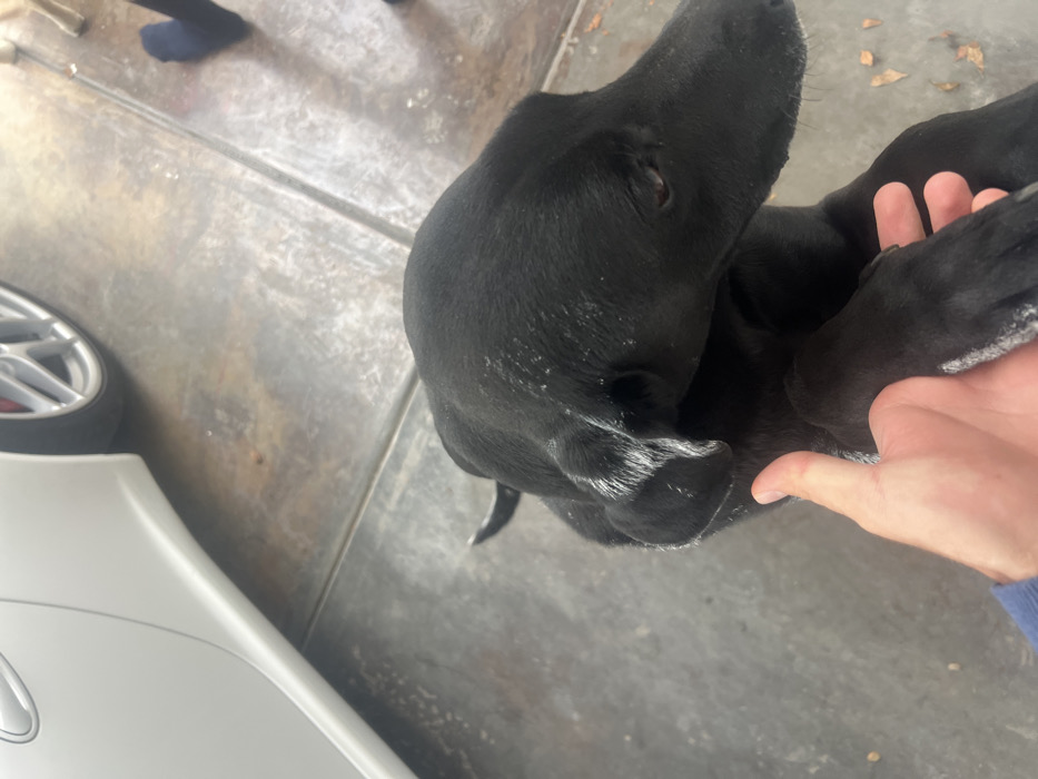 A black dog stands on a concrete floor. Part of a white car is visible on the left. The dog is being petted by a hand. The dog looks upward. The floor appears to be in a garage. The person petting the dog is wearing blue sleeves. A wheel and tire can be seen on the left.