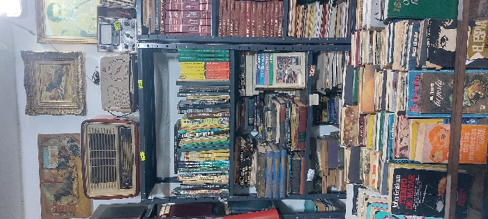 A cluttered scene features shelves overflowing with books. The shelves are metal and multi-tiered. Various framed pictures and vintage appliances, including a heater, hang on the wall adjacent to the shelves. The books are arranged haphazardly, with different sizes and colors visible. The image conveys a sense of a vintage store or a packed personal collection.