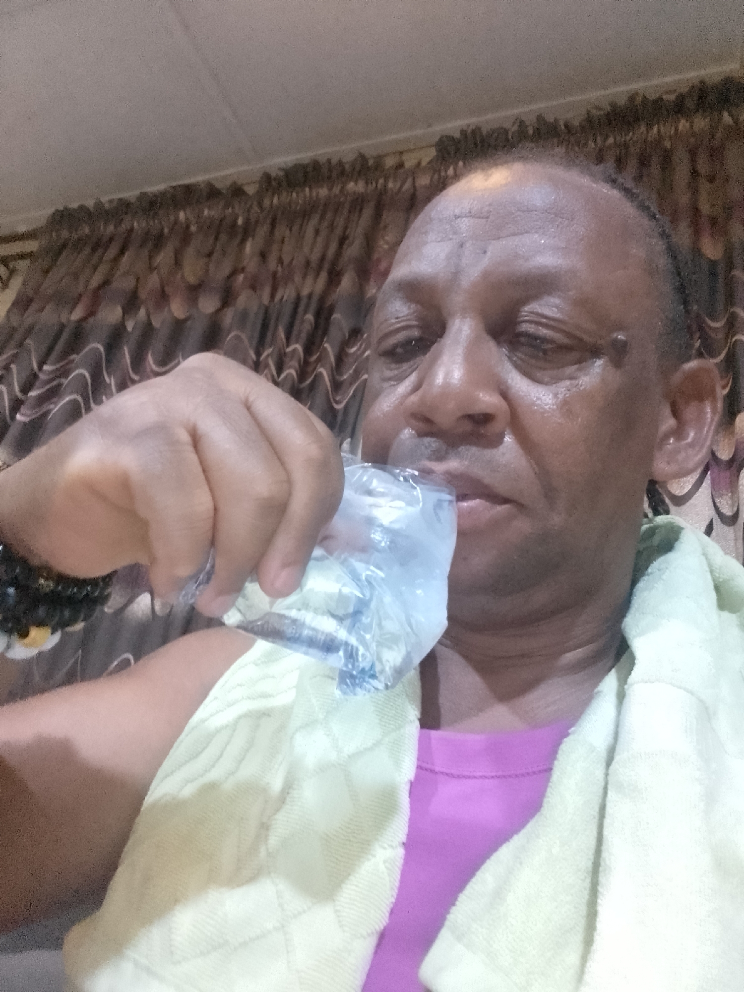 An individual, presumably male, is holding a plastic bag of water to his mouth, possibly drinking. He has dark skin, short hair, and a mole visible on his right temple. He is wearing a pink shirt and has a light-colored towel draped around his neck. He also has a beaded bracelet on his left wrist. The background shows brown curtains with a patterned design. The location is unspecified except that the city is Narayi, Nigeria.