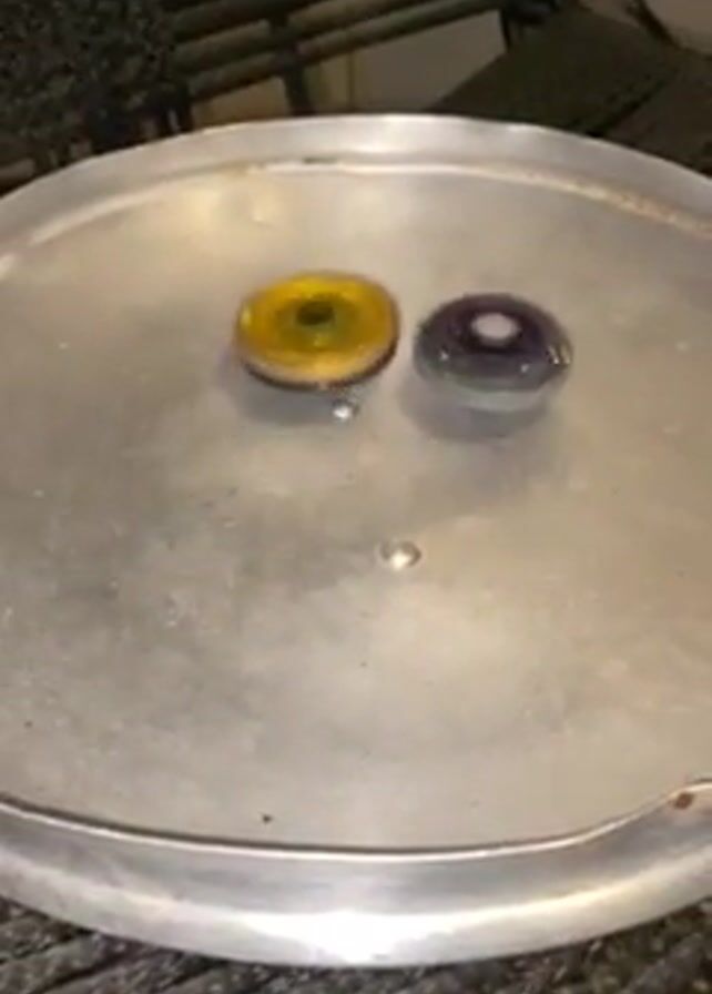 - "A close-up, static shot shows two Beyblades spinning on a circular metal surface that resembles a pizza pan" by FM-IpUZF2, licensed under CC BY 4.0