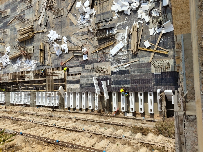 The image presents an overhead forensic view of an active construction site in Jerusalem, Israel, under daylight conditions. The scene primarily depicts the foundational or lower-level structural development of a building. To the left, a steep, excavated dirt embankment rises, featuring a series of horizontal metal rails secured by blue-capped posts, suggesting either temporary shoring, a future railway bed, or erosion control elements. The central and right portions of the image display the construction area. Numerous white, hollow, rectangular polystyrene forms are systematically arranged in parallel rows, likely functioning as void formers for a reinforced concrete slab or beam structure. Vertical steel rebar cages are visible throughout the site, indicating future columns or shear walls. The ground surface is a mix of dark, textured formwork sheeting, exposed concrete, and scattered wooden planks. At least four construction workers are present. Two individuals, wearing yellow safety vests and blue shirts, are actively engaged in positioning or adjusting the white polystyrene forms in the lower-middle section of the site. Other workers are less distinctly visible amidst the wooden formwork and rebar in the background. Materials scattered across the site include substantial piles of rough-cut timber planks, bundles of steel rebar, and numerous fragments of white polystyrene debris, indicative of ongoing cutting and shaping operations. The overall environment suggests active preparation for a significant concrete pour, with structural elements being formed and reinforced.