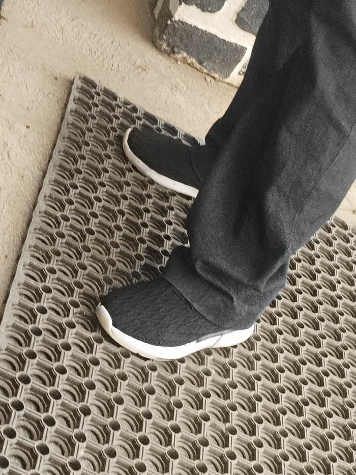 In Gura Top, Nigeria, a person stands with both feet on a light grey rubber mat. The mat features a repeating pattern of raised circular and scalloped elements. The individual wears dark grey trousers, slightly creased, covering the ankles. Their feet are clad in dark grey slip-on athletic shoes with distinct white soles and white toe caps. The left foot is positioned slightly forward on the mat. Adjacent to the mat, a light-colored, possibly concrete or tiled floor is visible. In the upper background, a dark, textured object with irregular white markings, possibly a stone or concrete block, forms part of a wall or structural element.