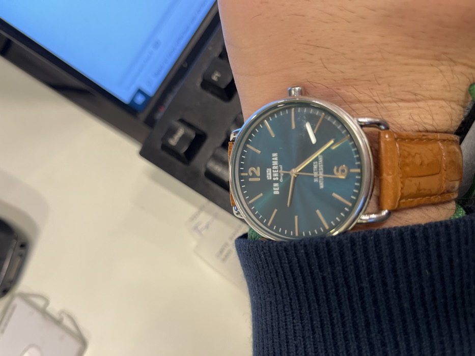 A close-up shows a watch on a wrist. The watch has a silver casing, a teal-colored face, and a brown leather band. The watch face reads "Ben Sherman" and "30 meters water resistant." The wrist is wearing a dark blue sweater. The scene also includes part of a black keyboard and a computer monitor. The surface underneath appears to be white.