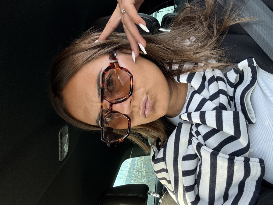 A female individual is depicted in a close-up portrait, seated within the interior of a vehicle. Her light brown hair is parted and falls around her shoulders. She wears large, hexagonal-framed sunglasses with a tortoiseshell pattern and amber-tinted lenses. Her lips are slightly pursed, and a faint furrow is visible on her brow. Her left hand is raised to her temple, with fingers slightly spread. This hand displays white, almond-shaped fingernails and a ring with a clear stone on the fourth finger. She is dressed in a light-colored top beneath a dark outer garment, with a black and white horizontally striped fabric draped across her chest and shoulders. The immediate environment includes a dark vehicle headliner, a visible overhead light fixture, and a dark headrest. Through a window on the left, an out-of-focus exterior shows sparse vegetation and distant terrain under a bright, overcast sky. The specific location within the city of Saint-Jean-Bonnefonds, France, cannot be determined from the visual evidence.