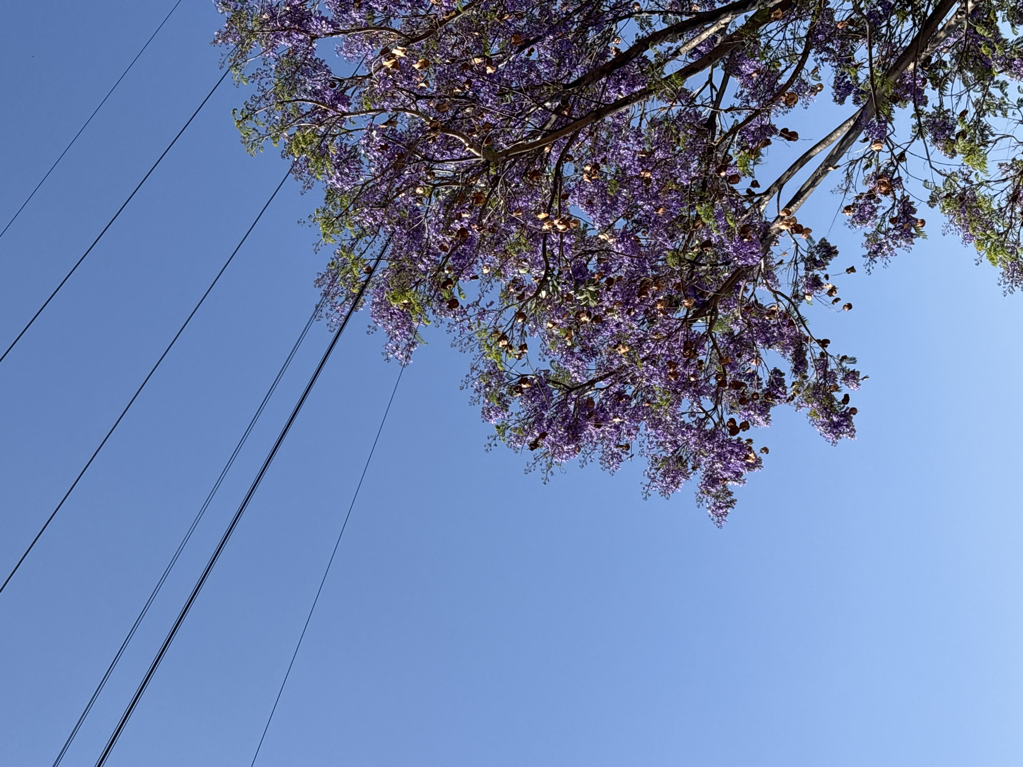 view looking upwards towards a clear blue sky in Cholula, Mexico. In the upper right portion of the frame, there are tree branches adorned with purple flowers and some brown seed pods, suggesting a Jacaranda tree. To the left, a set of parallel power lines extends diagonally across the sky.