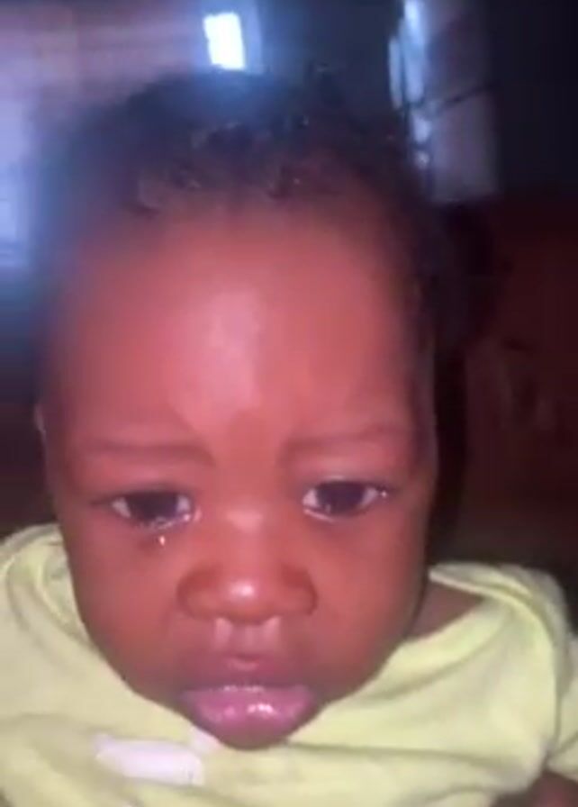 close-up of a crying baby. The baby has dark skin, short curly hair, and is wearing a light green shirt. Tears are visible in the baby's eyes and on their face. The background is dark and blurry, making it difficult to discern any specific details. The camera angle is focused on the baby's face, emphasizing the baby's distress. A hand is seen holding the baby.