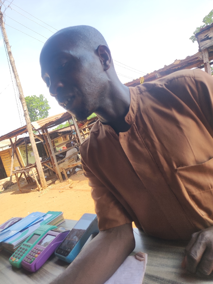 The image captures an outdoor commercial scene located in Akwanga, Nigeria, under clear daylight conditions. In the foreground, a dark-skinned male individual with a close-cropped haircut is depicted, angled towards the left. He wears a plain, light-brown, long-sleeved garment with a mandarin collar. His face is partially shadowed, and his mouth is slightly open, suggesting a smile or speaking. His right forearm rests on a light-colored table surface. On the table directly in front of the man are three Point-of-Sale (POS) devices arranged from left to right: one green, one purple, and one blue-grey with a larger screen. Behind these devices are stacks of paper or small booklets, some with light blue covers. The background consists of an informal market area characterized by multiple rudimentary structures constructed with wooden frames and corrugated metal roofs, some exhibiting signs of rust. The ground throughout the visible area is reddish-brown dirt. One person is faintly visible sitting within one of the background stalls. A wooden utility pole stands prominently on the far left, extending upwards towards the bright, clear sky.