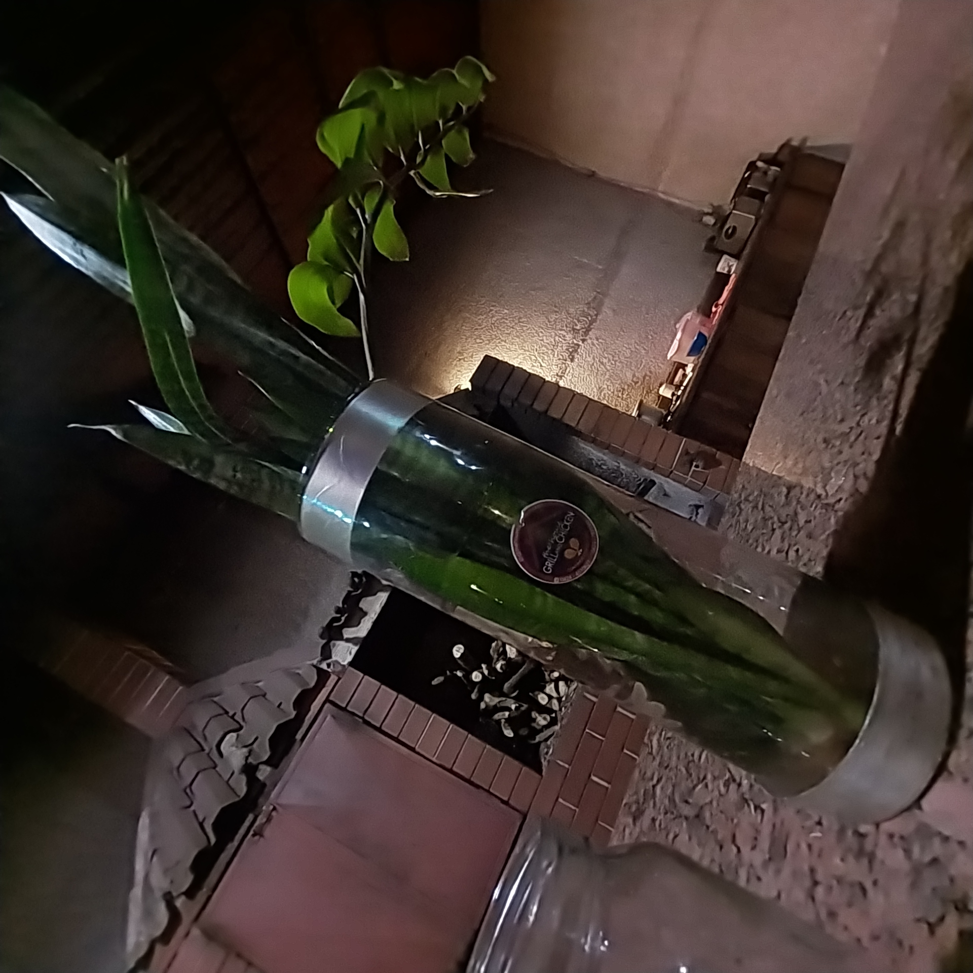 The image depicts a plant arrangement in a glass vase with silver trim, sitting on a textured surface near a brick structure. The plant arrangement includes both tall, blade-like leaves of a snake plant and rounded leaves of another green plant. A sticker is visible on the side of the vase. The surrounding area shows elements of brickwork, possibly forming part of a grill or outdoor cooking area, and a glimpse of a building or structure in the background. The lighting is dim and uneven. Given the provided context, the scene is likely located in Tinaquillo, Venezuela.