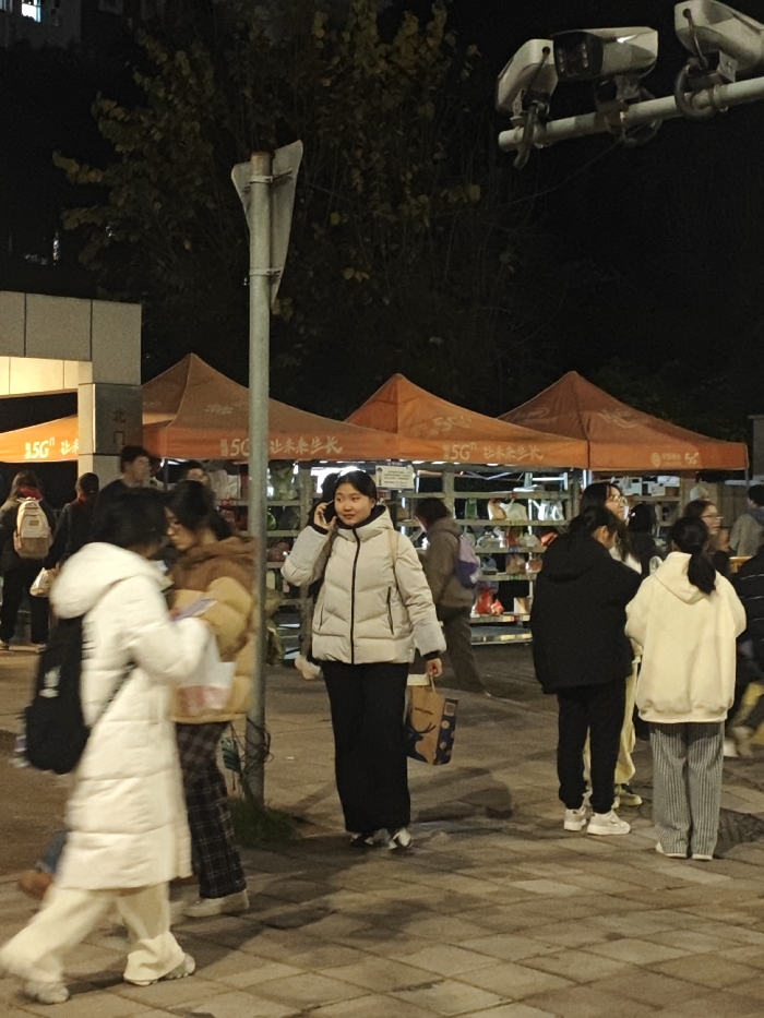 The image depicts a nighttime street scene in Shapingba District, China, characterized by pedestrian activity and temporary market stalls. The scene is illuminated by artificial lights, casting shadows on the paved ground. In the mid-ground, three orange-canopied market stalls are visible, each displaying "5G" and Chinese characters. These stalls feature shelving stocked with various items, though specific details are indistinct. Above the stalls and to the right, two white surveillance cameras are mounted on a horizontal pole. A grey metal pole, possibly for a street sign, stands prominently in the center-left foreground. Approximately ten to fifteen individuals, primarily young adults, are present. In the central foreground, a woman wearing a light-colored puffer jacket and dark pants is walking right, talking on a mobile phone held to her right ear, and carrying a dark shopping bag with a light design in her left hand. To her left, another woman in a long white puffer coat and white pants walks left, partially blurred due to motion. Behind the central woman, a person in a brown and tan puffer jacket is looking at a mobile phone. Further into the mid-ground, individuals are seen walking, standing, and observing the market stalls. Some pedestrians carry bags. The background features dark foliage and a glimpse of a building on the far left. The ground is paved with rectangular tiles.