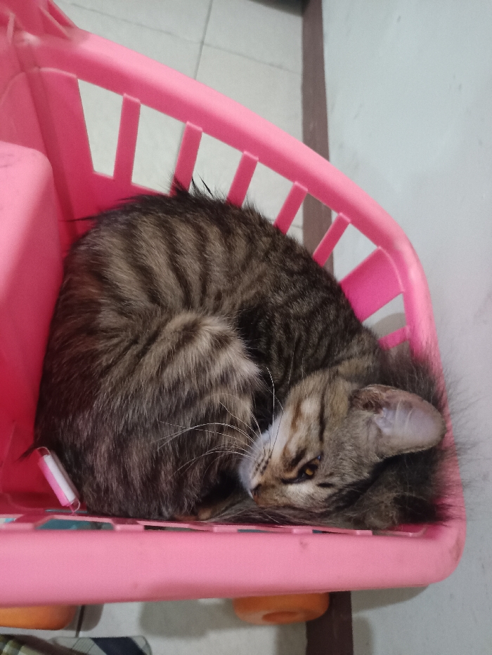 An indoor scene in Maleber, Indonesia, depicts a domestic tabby cat resting within a pink plastic basket