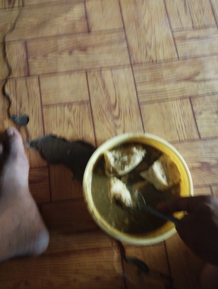 A person's bare foot is visible in the lower left corner of the image. The foot is partially obscured by a crack in the wooden floor. A yellow bowl containing a brown liquid and pieces of light-colored food is in the lower right corner. A hand is visible holding a spoon that is partially submerged in the bowl. The coordinates 10.852, 11.426 correspond to a location in Bajoga, Nigeria. The scene is a close-up of someone eating a meal on a wooden floor. The meal appears to be a type of soup or stew. The lighting is dim. The environment is domestic.