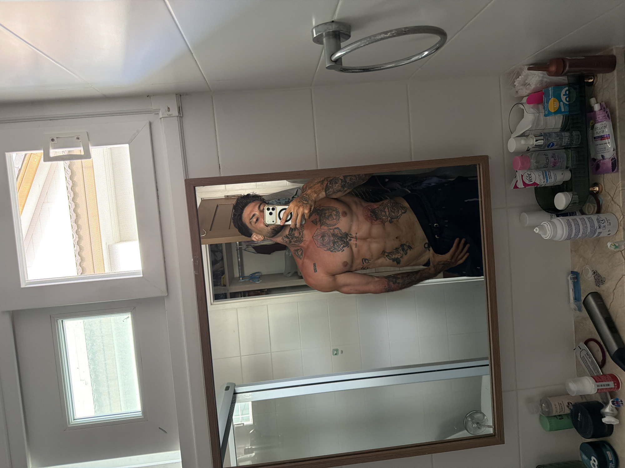 A shirtless male with extensive tattoos poses for a mirror selfie in a bathroom. The bathroom features a white tiled wall, a shower area with a partial glass screen, and a shelf laden with toiletries and personal care products. A window with sheer curtains is visible to the left of the mirror. There is no indication of the location being in Chalong, Thailand.
