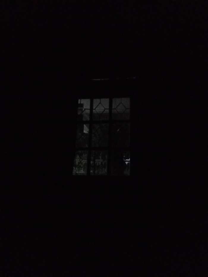 The image depicts a rectangular, multi-pane window set within an extremely dark wall, presumably an interior, at an unspecified location in Qorday, Kazakhstan