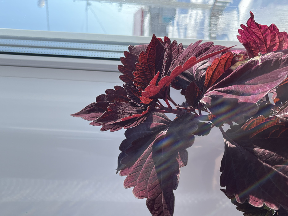 - "This image depicts a houseplant, identified as a Coleus, with prominent deep red to purple, serrated leaves, positioned indoors in front of a window" by FM-jR63L2, licensed under CC BY 4.0