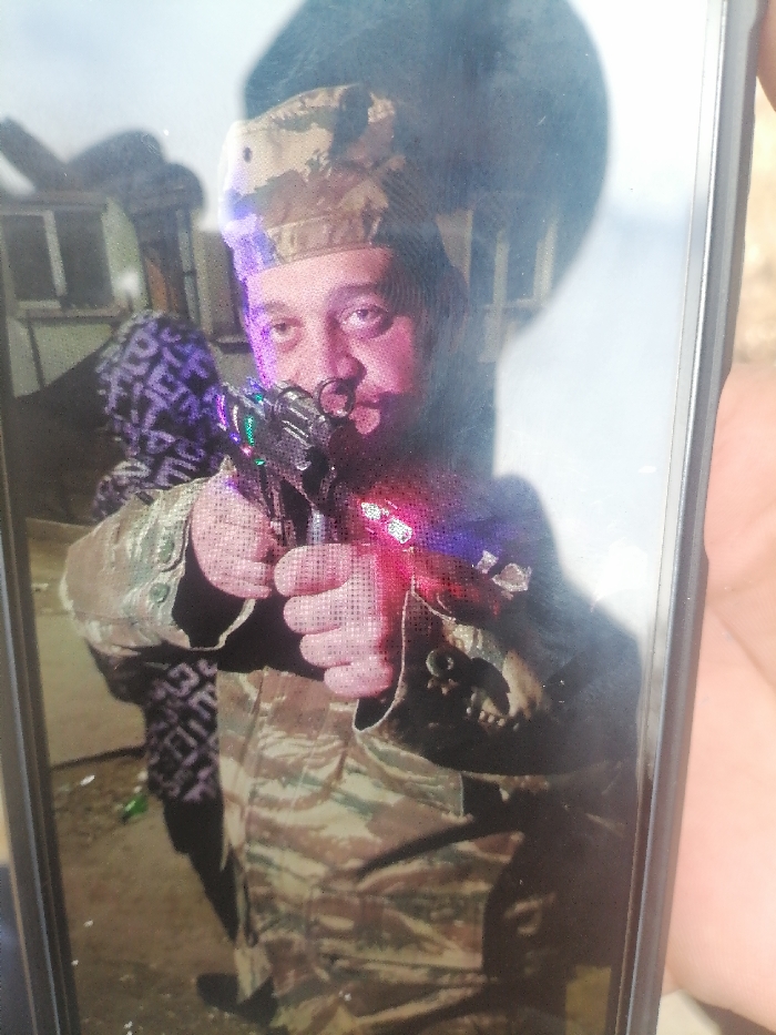 The image displays a photograph of a smartphone screen, held by a hand visible on the right side, showing an individual. The scene is located in the city of Sredets, Bulgaria. The primary subject within the displayed photograph is an adult male, seen from the chest up, positioned centrally and looking directly forward. He wears a camouflage pattern military-style cap and a matching long-sleeved uniform shirt or jacket. He has a dark mustache and a metallic ring object is visible through his left nostril. The subject holds a dark-colored toy firearm with both hands, pointing it directly towards the viewer. The toy firearm emits multiple colored lights (red, green, blue, purple) from its body and features a prominent ring-like attachment at its muzzle. His right index finger is positioned near the trigger guard. Behind the primary subject's left shoulder, a second individual is partially visible, wearing dark clothing with a light-colored geometric pattern. The background of the displayed photograph is somewhat indistinct, suggesting an outdoor or semi-enclosed environment, possibly featuring structures or debris. On the ground to the left, a green object, possibly a bottle, and some white litter are discernible. The lighting in the displayed image is uneven. The photograph of the phone screen itself exhibits reflections and glare across the screen surface, particularly over the subject's face and the toy firearm.