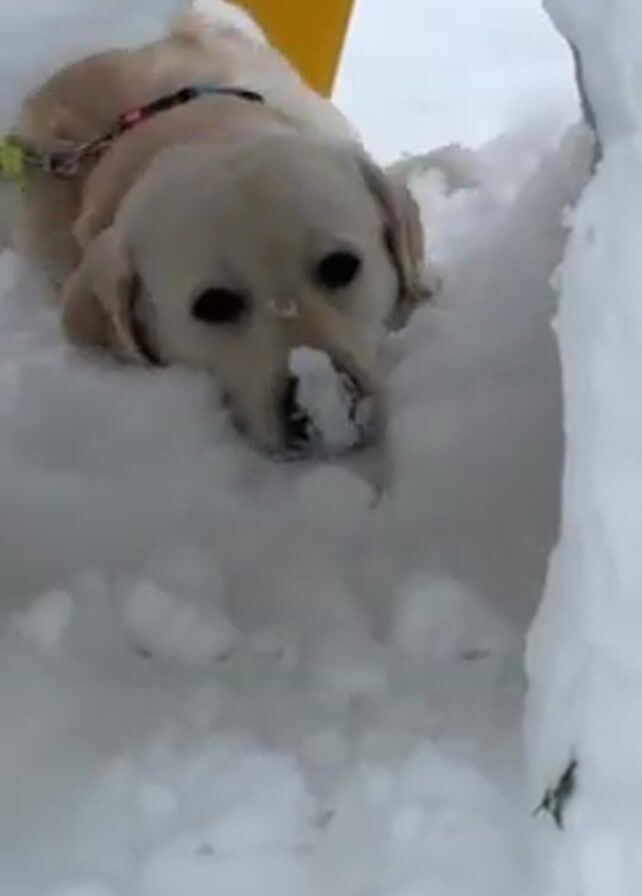 A light-colored Labrador Retriever is sitting in a snow tunnel. The dog's nose is covered in snow. The tunnel is rectangular. At the end of the video, the camera pulls back to show that the tunnel is in a snowbank. In the background, a building can be seen.