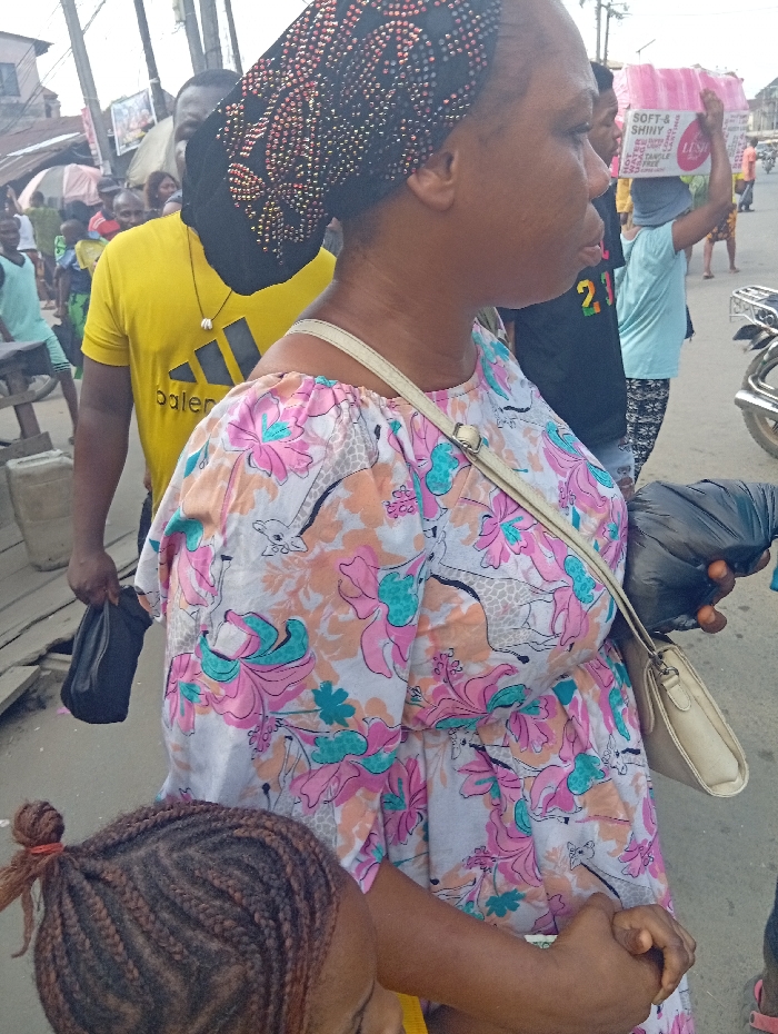 A woman with a black headscarf with gold studs wears a floral dress with pink and teal designs. A light-colored purse hangs from her shoulder. Behind her, a man in a yellow Adidas shirt holds a black bag. Children are visible in the background. Another woman with braided hair is at the bottom left. Someone carries a package of “Soft & Shiny” tissue on their head. The scene appears to be outdoors on a street.