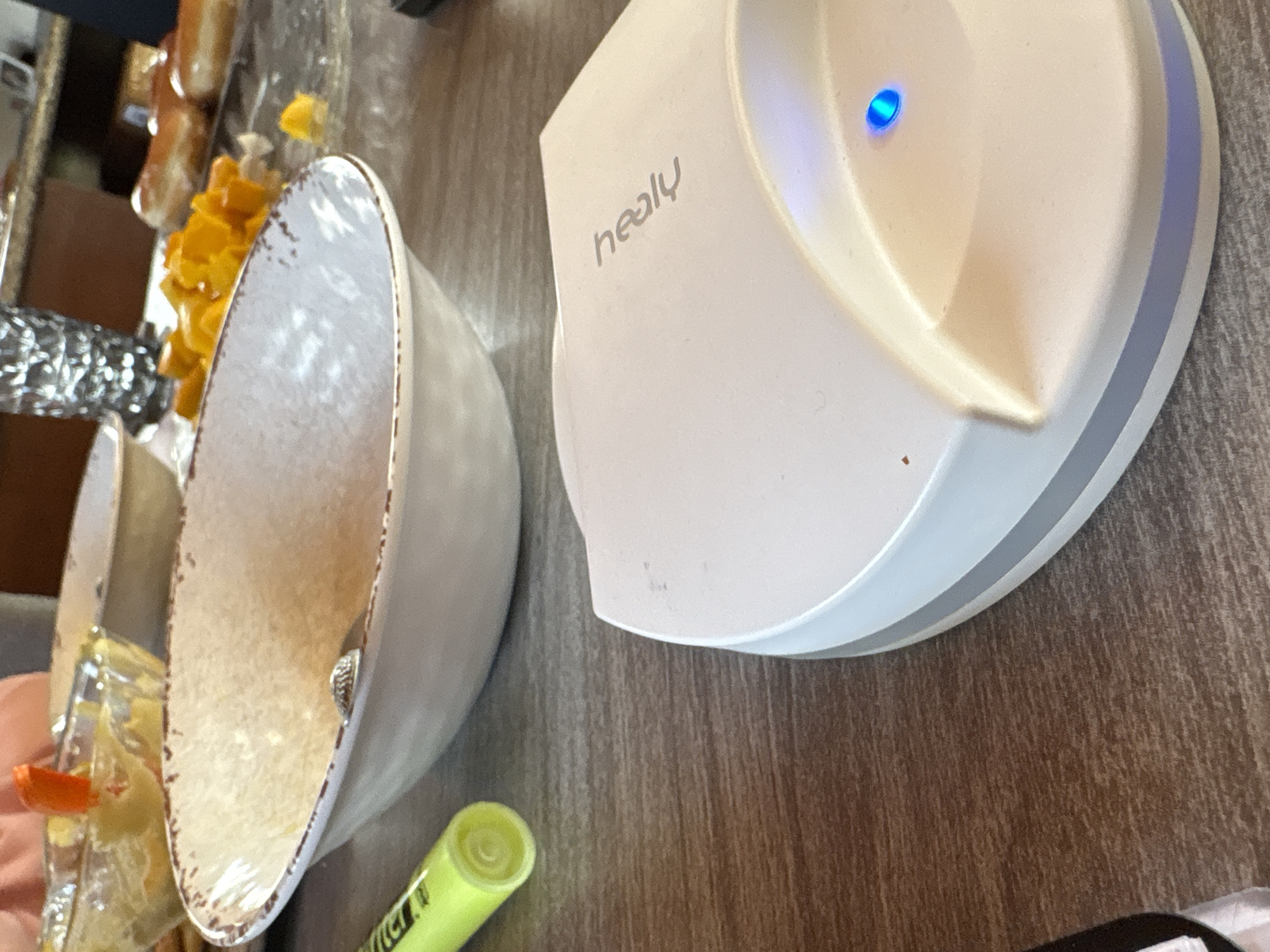 A high-angle shot depicts a tabletop scene with diverse objects. A partially filled white bowl with a textured rim sits left of center, containing what appears to be food and an orange slice. Next to it is a white electronic device with the brand "healy" printed on top and a blue light illuminated. A yellow highlighter is situated beneath the bowl. In the background, there is more food and a foil-wrapped item. The table has a wood-grain pattern. The location, Cholula, Mexico, is not evident from the visual information provided.