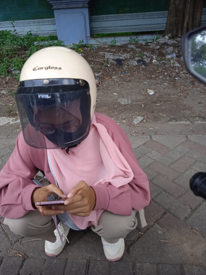 A person in a pink outfit, beige pants, and white sneakers is crouched on a brick surface. They are wearing a cream-colored motorcycle helmet with a dark tinted visor and are holding a purple mobile phone in their hands, seemingly using it. A pink scarf is wrapped around their neck. The background includes greenery, a tree trunk, and a glimpse of a motorcycle mirror.