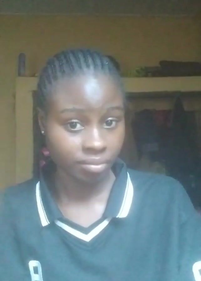A young woman is shown in a selfie-style video, shot in a bedroom or dorm room. She has dark skin, braided hair, and is wearing a dark grey t-shirt with white trim. Her expression is neutral and she looks directly at the camera. She briefly touches the side of her face, and then the top of her head, adjusting her hair. The background shows a bunk bed with some items stored on the top bunk, and a wall painted a muted yellow. The lighting is somewhat dim.
