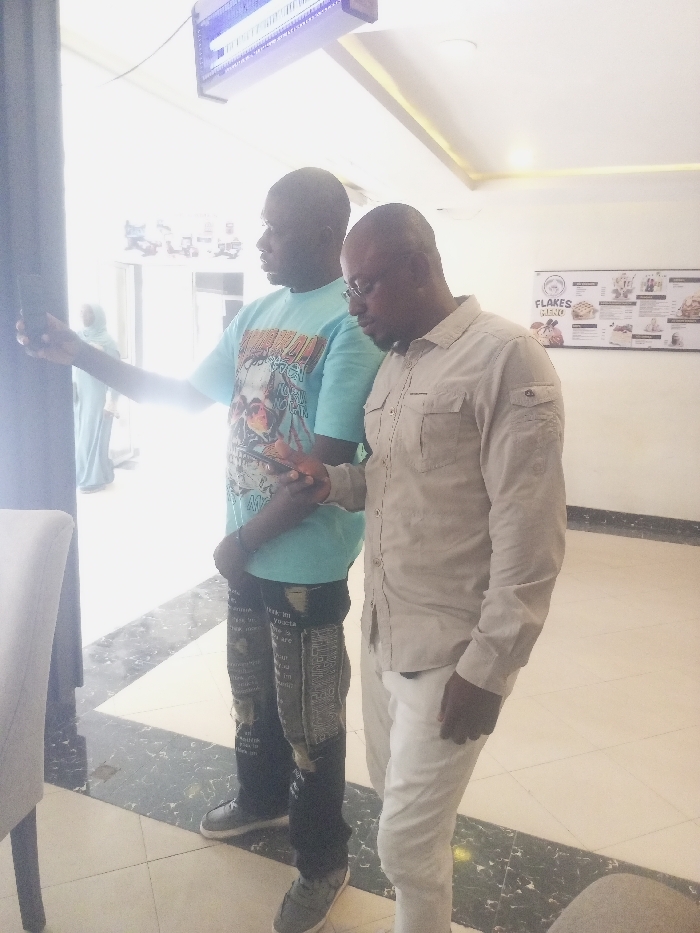 In an indoor establishment located in Darmanawa, Nigeria, two adult males stand in the foreground