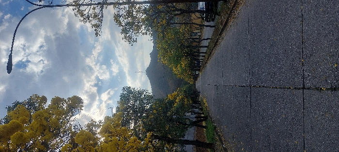 A road stretches towards a mountain in the distance, lined with trees bearing yellow flowers. The sky is cloudy, with patches of blue visible. A street lamp curves into the frame on the left side. The perspective is slightly tilted. The road surface is dark and shows signs of wear. Some parked cars are seen.