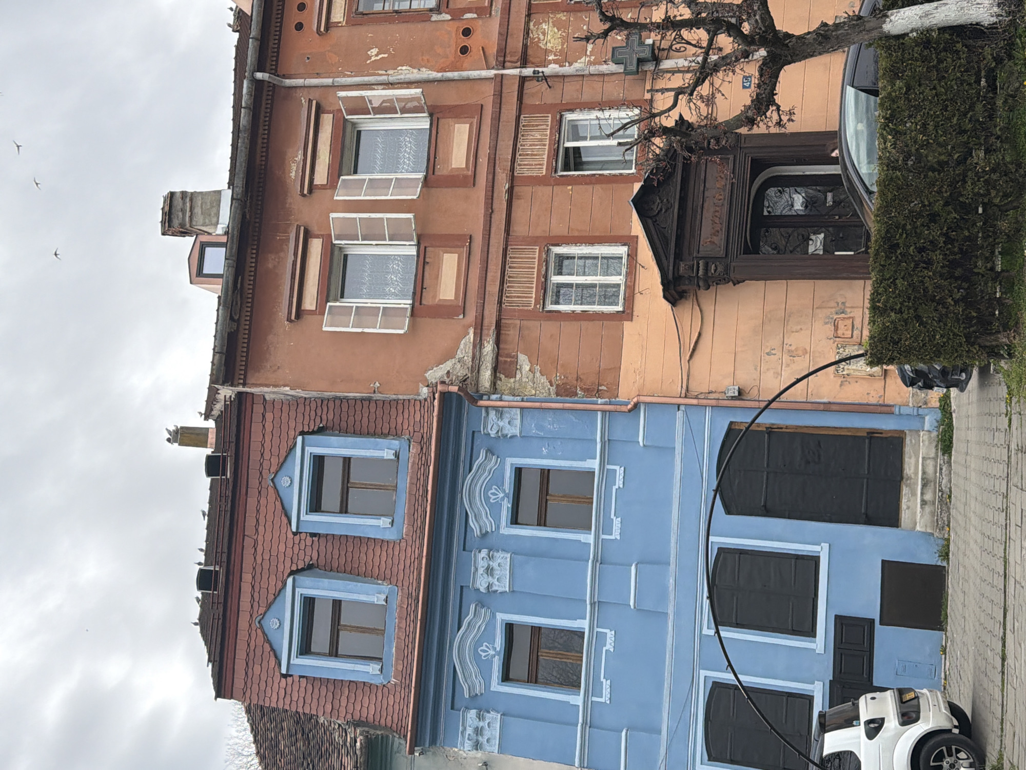 two adjacent buildings in Sighișoara, Romania. The building on the left has a red tiled roof and blue facade with three visible windows. The building on the right has a two-toned orange facade with four visible windows on the upper floor and a door with ornate carvings. A black car and trimmed shrubbery are to the right of the buildings. A white car is parked in front of the buildings. The sky is overcast.