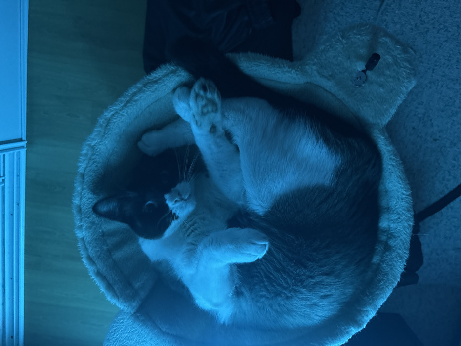A black and white cat is curled up in a fluffy cat bed. The cat is on its back with its paws raised in the air. The bed has a circular shape and a soft, cushioned rim. The lighting in the room appears to be blue, creating a cool tone in the image. Part of a cabinet is on the left.