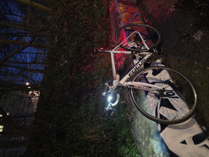 The image displays an outdoor scene at night or in very low light conditions. A white 'FOCUS' brand road bicycle, featuring red accents on its frame, is positioned prominently in the midground, leaning against a low concrete barrier. The bicycle's front light is active, emitting a bright white beam that illuminates the ground and the lower section of the barrier to the left, revealing white graffiti characters, including what appears to be "A" and "161". A red rear light on the bicycle's seat post is also active, casting a red glow onto the upper section of the barrier to the right, which is covered in red and orange graffiti. The foreground consists of dark, textured ground with scattered dried leaves. In the background, a steep, vegetated incline covered in dark foliage and bare tree branches is visible. Above this slope, a fence and distant lights are discernible through the bare tree canopy, silhouetted against a deep blue sky. No individuals are present. The specific location within Hamburg, Germany, cannot be determined from the visual information provided.