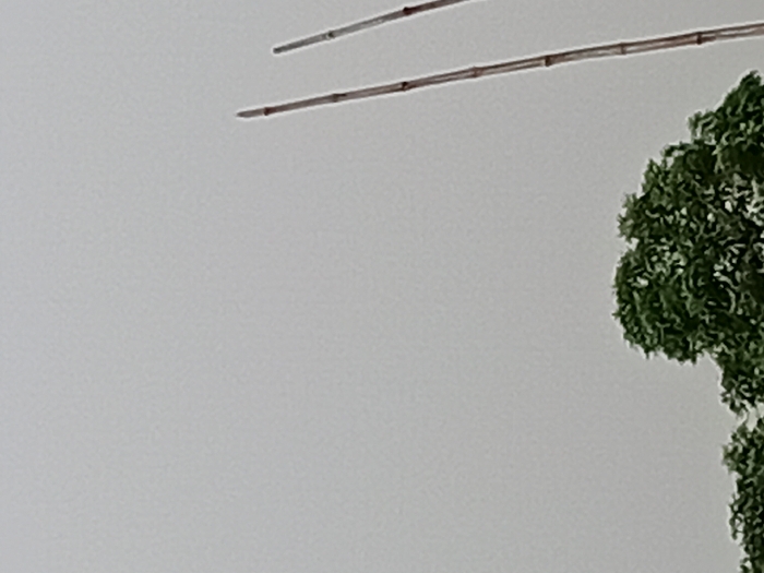 Against a light gray backdrop, a cluster of lush, dark green foliage occupies the right side of the frame. Above it, two parallel brown rods extend inward from the upper right. These rods are textured with subtle segments. The gray background is smooth and expansive, taking up the majority of the visual space and contrasting with the intricate details of the foliage and the stark lines of the rods.