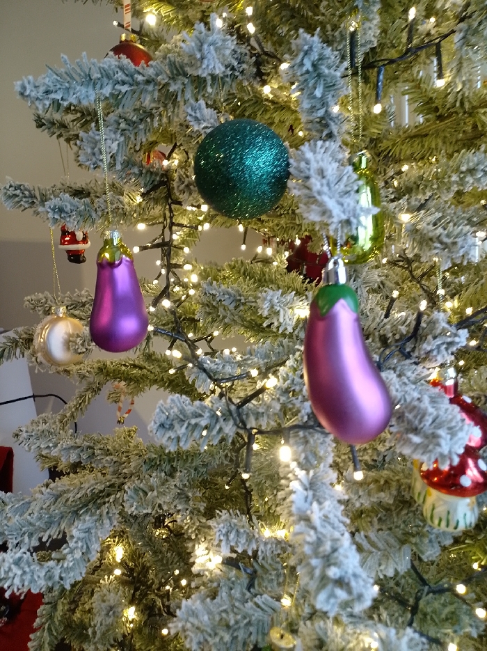 The image displays a detailed view of a decorated Christmas tree, located in Schiltigheim, France. The artificial tree features green branches lightly coated with white flocking, simulating snow, and is illuminated by numerous small white LED lights strung throughout its foliage. Multiple ornaments are visible, including two prominent matte purple eggplant-shaped figures with green caps, each suspended by a metallic chain. Other decorations include a shimmering dark green spherical bauble, a glossy light green elongated ornament, a small red Santa Claus figure, a pale gold spherical ornament, and a red-capped mushroom ornament with a white stem. Additional indistinct red and multicolored ornaments are partially visible deeper within the branches. The background is blurred, indicating an indoor environment. No individuals or specific actions are depicted within the frame.
