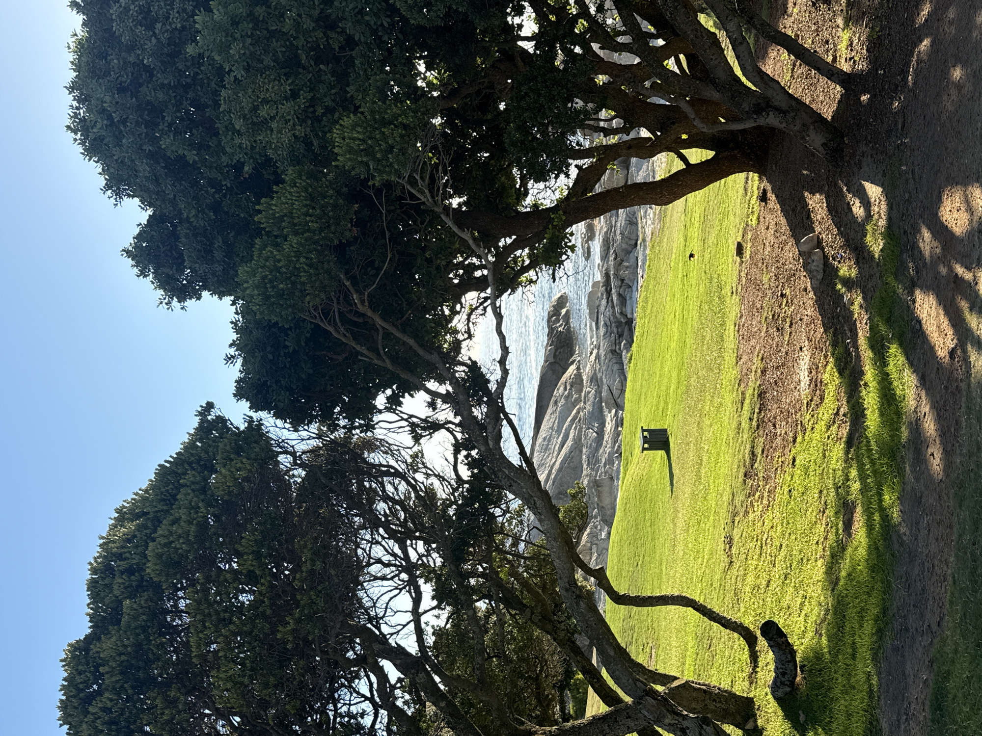 The image displays a coastal scene in Cape Town, South Africa, under a clear, bright blue sky. Strong, directional sunlight, consistent with either early morning or late afternoon, casts long, defined shadows across the ground. Two large, gnarled trees with dense green foliage frame the view. The tree on the left features thick, curving branches, while the tree on the right has multiple robust trunks. Between these trees, a vibrant green, manicured grassy slope descends and then rises towards the ocean. A dark-colored, rectangular trash bin with a sloped lid is positioned on this grassy slope, casting a short shadow. A small, dark bird is visible in mid-flight over the grass towards the right side of the frame. The immediate foreground consists of a dirt path or bare earth, heavily shadowed by the tree canopy. In the background, a rocky coastline composed of large, light-grey boulders extends into a deep blue ocean, where white-capped waves are seen breaking against the shore. No human subjects are present in the scene.